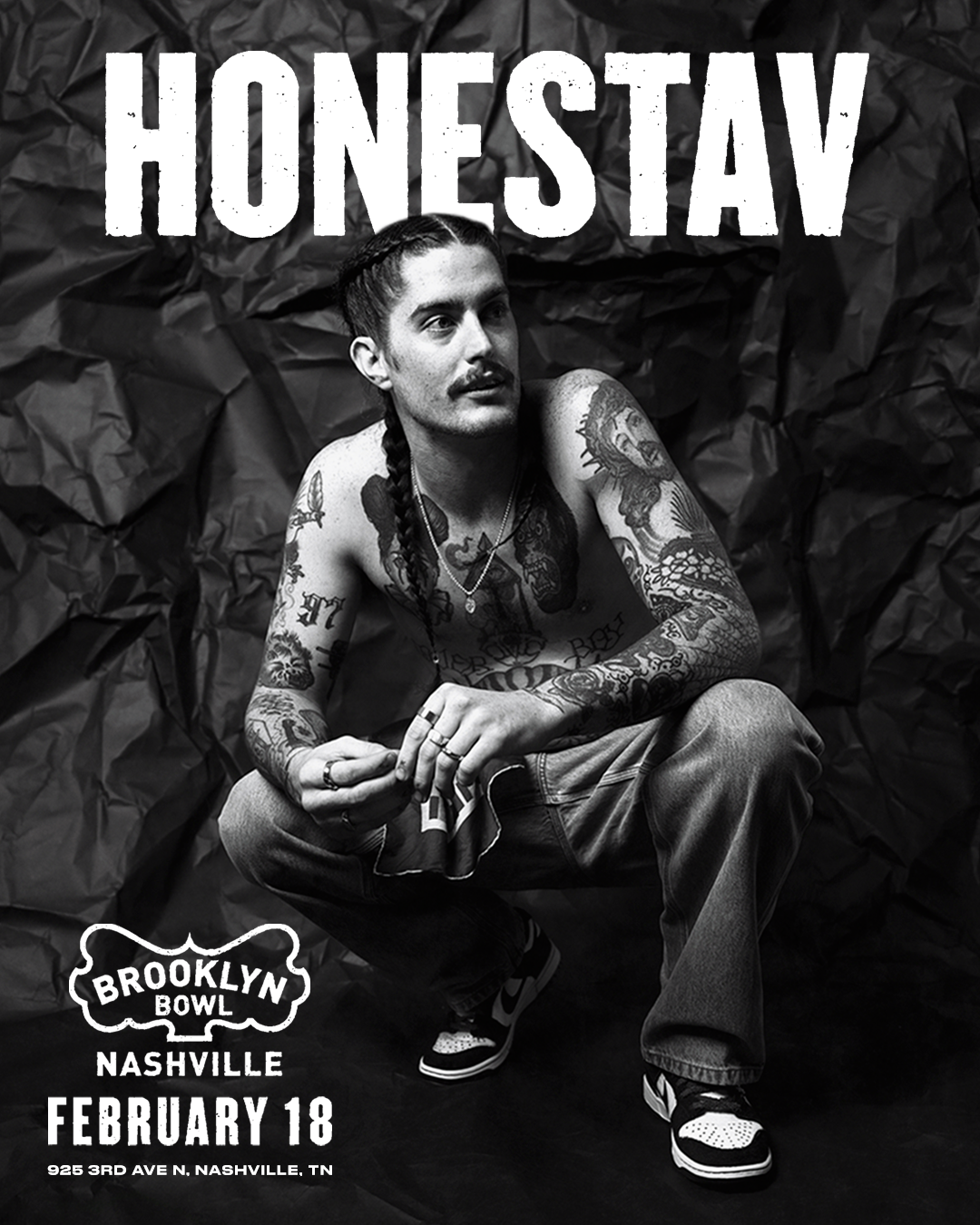 Missouri's honestav blends indie-folk, hip-hop and alt-pop into raw, emotional songs about loss and healing. His breakout hit "I'd Rather Overdose" has amassed 88M+ streams globally. Catch him live at Brooklyn Bowl Nashville on Wednesday February 18!
